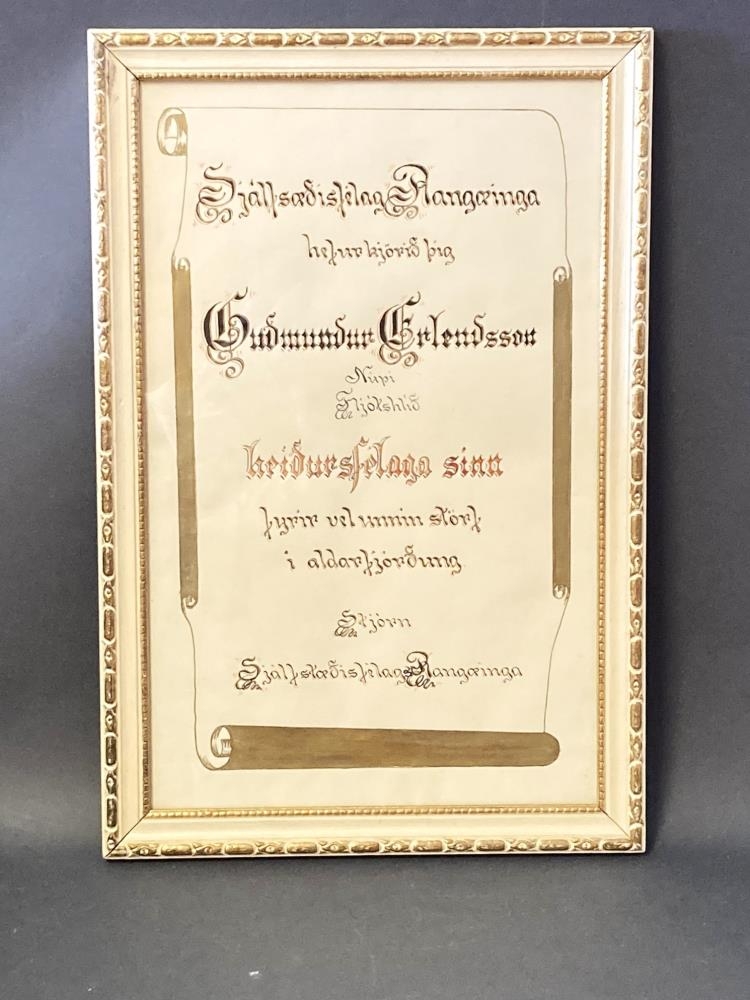 Heiðursskjal, innrammað. Sjálfstæðisfélag Rangæinga hefur kjörið þig Guðmundur Erlendsson Núpi Fljótshlíð heiðursfélaga sinn fyrir vel unnin störf í aldarfjórðung. Stjórn Sjálfstæðisfélag Rangæinga.