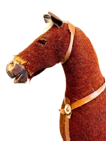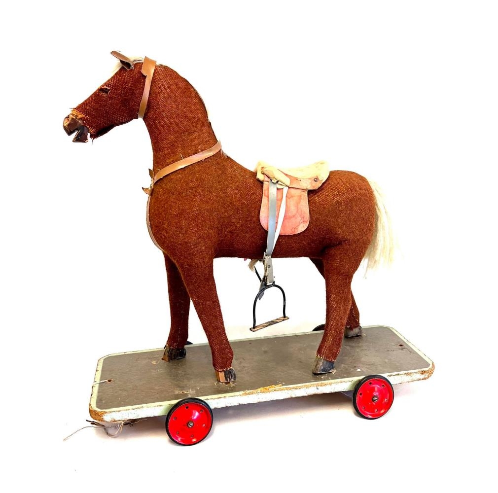 Hestur á hjólabretti, brúnn. Keyptur á markaði í Hanower Þýskalandi. Þá bjuggu þau þar.