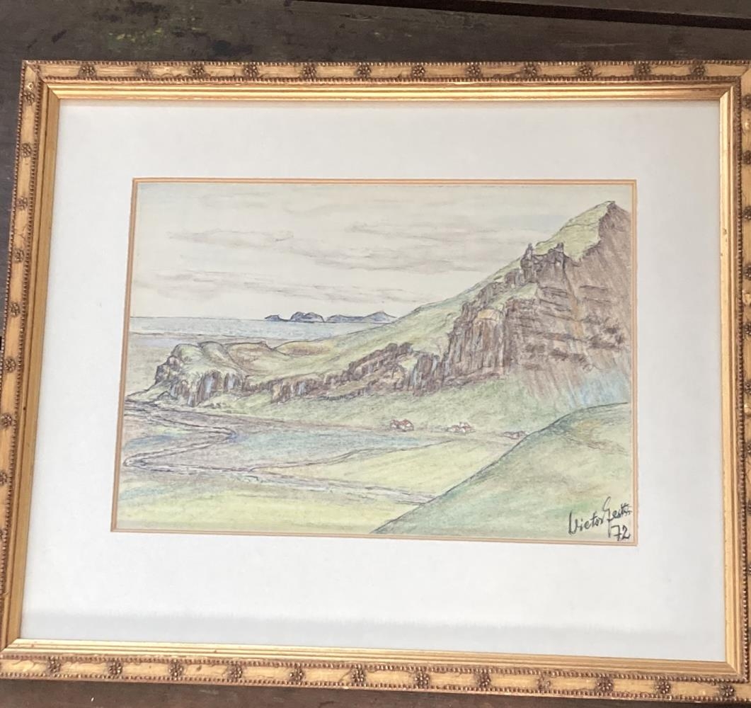 Mynd af Drangshlíðarfjalli og Skógarnúpi. Innrömmuð. Verk Victors Gestssonar læknis 1972.