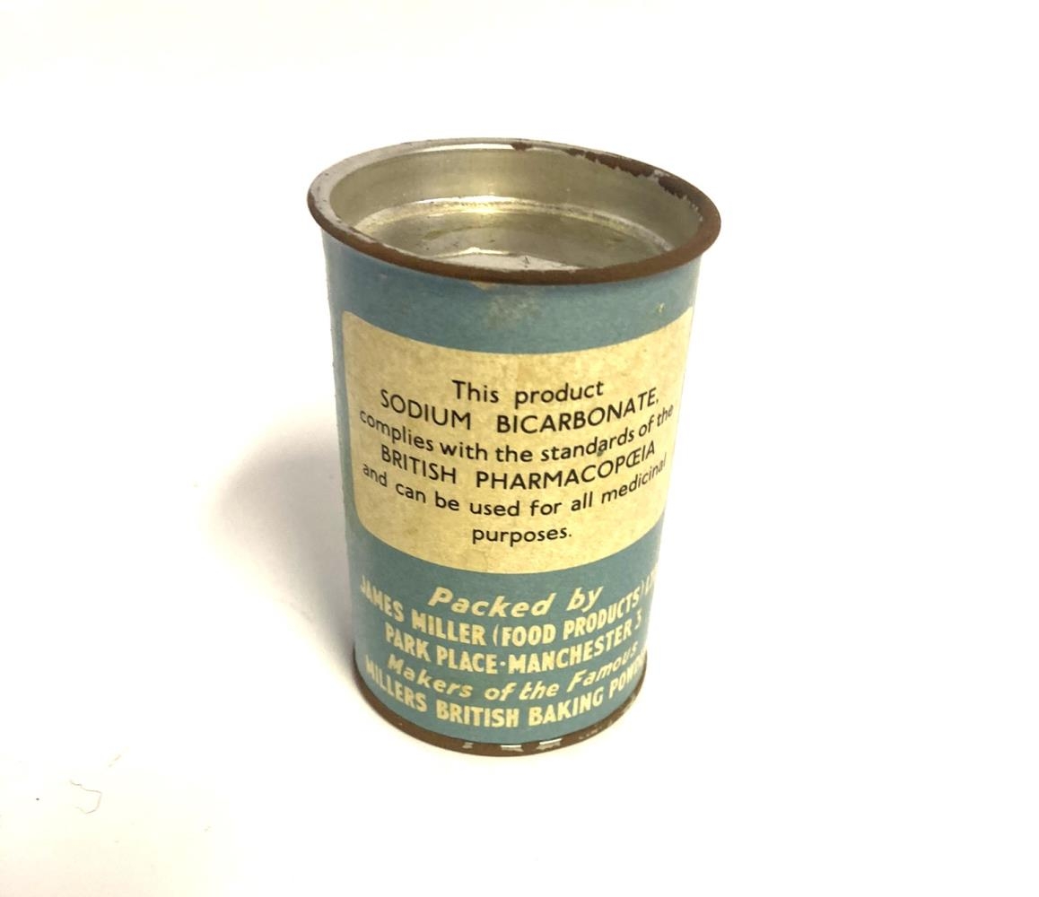 Dós undir sódaduft. Miller´s Bicarbonate of Soda, Baking Soda. Í dósinni eru geymdar tölur.