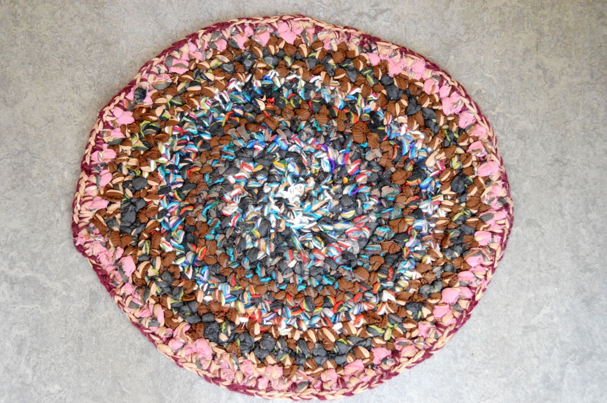 Kriglótt tuskumotta, hekluð af tengdamóður gefanda, Dýrfinnu Jónsdóttur húsfreyju í Eyvindarhólum um 1975. Þvermál 50 cm. Ýmsir litir.