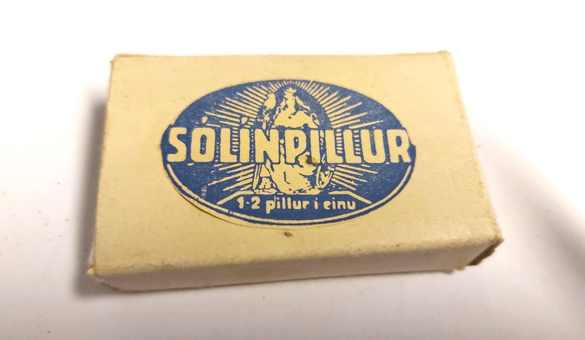 Lyfjaumbúðir, pappaaskja. Álímdur blár miði frá Laugavegs apóteki. "Sólínpillur - 1-2 pillur í einu". Í öskjunni er bréfpoki með 12 svörtum kúlulaga pillum.