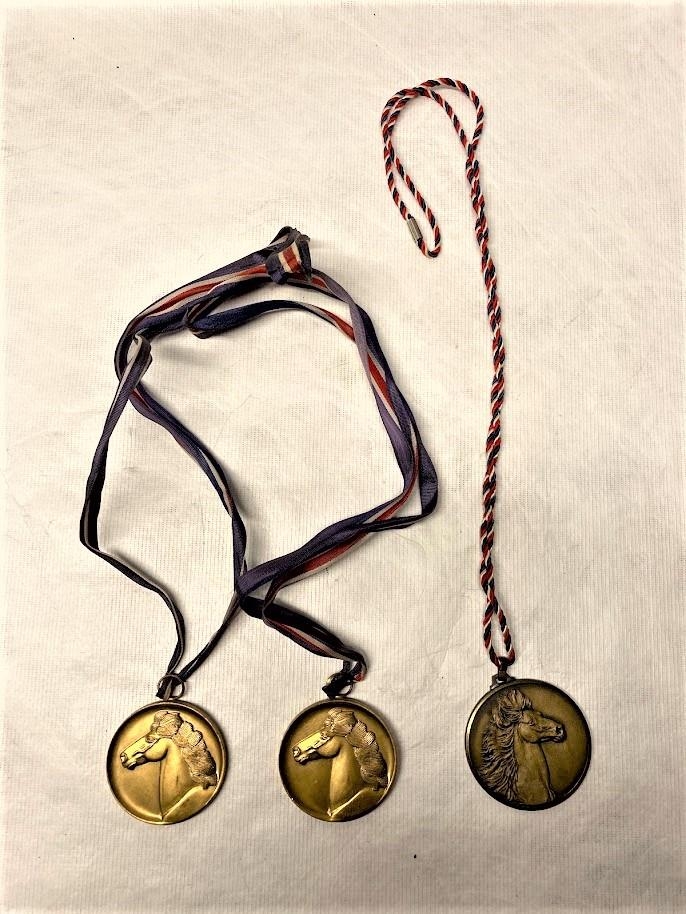 Koparskjöldur, 4,8 cm í þvermál í fánahengi. Hestmynd upphleypt. Á bakhlið:"Landbúnaðarsýningin á Selfossi 1978. Hryssan Tinna."