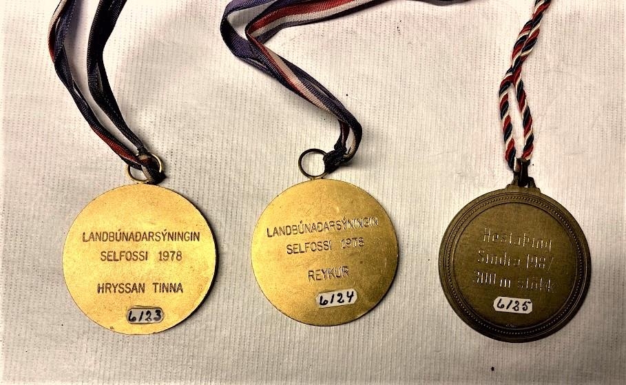 Koparskjöldur, 4,8 cm í þvermál í fánahengi. Hestmynd upphleypt. Á bakhlið:"Landbúnaðarsýningin á Selfossi 1978. Hesturinn Reykur."