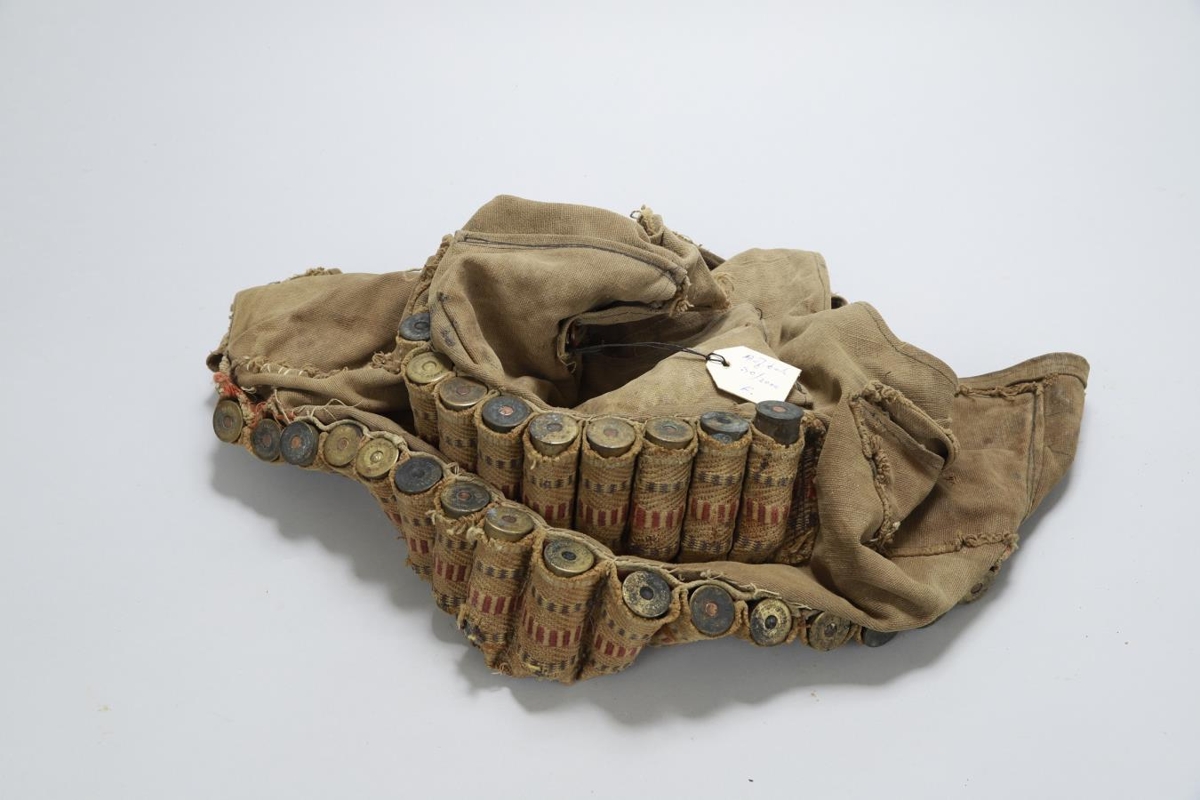 Skotvesti úr þjálum segldúk með hólfum fyrir 25 haglaskot og í þeim eru tómar patrónur. Orðið mjög snjáð og lúið. Kom með fleiri gripum sem sóttir voru í útihús á Reyðarfirði sem faðir gefenda hafði átt, áður en það var rifið.