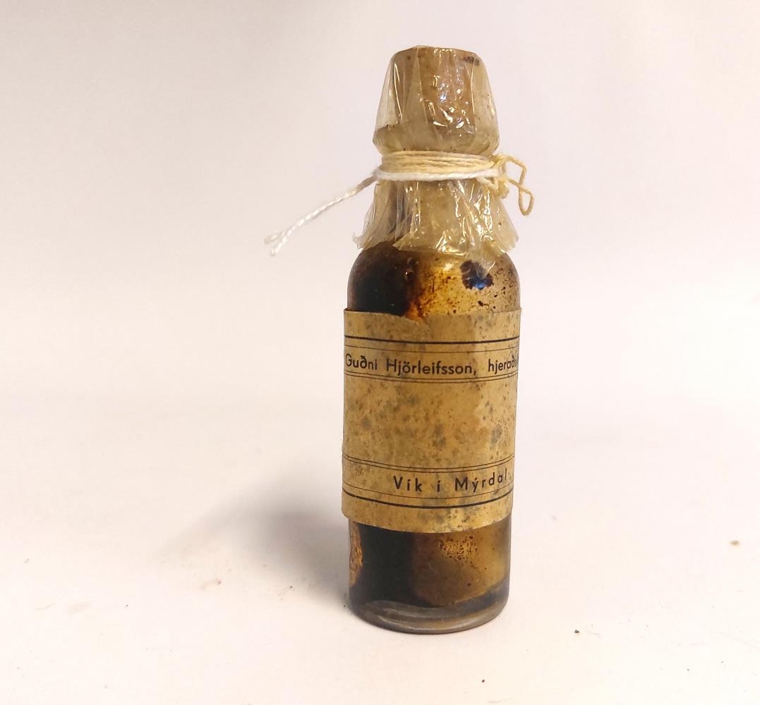 Lyfjaglas, glært með korktappa. Álímdur miði; Guðni Hjörleifsson hjeraðslæknir, Vík í Mýrdal. Óvíst um innihald en hefur verið brúnn vökvi. Guðni Hjörleifsson læknir (f. 24.7.1894 að Skarðshlíð u.Eyjafj. - d. 23.6.1936) var héraðslæknir í Vík í Mýrdal 1926-1936.