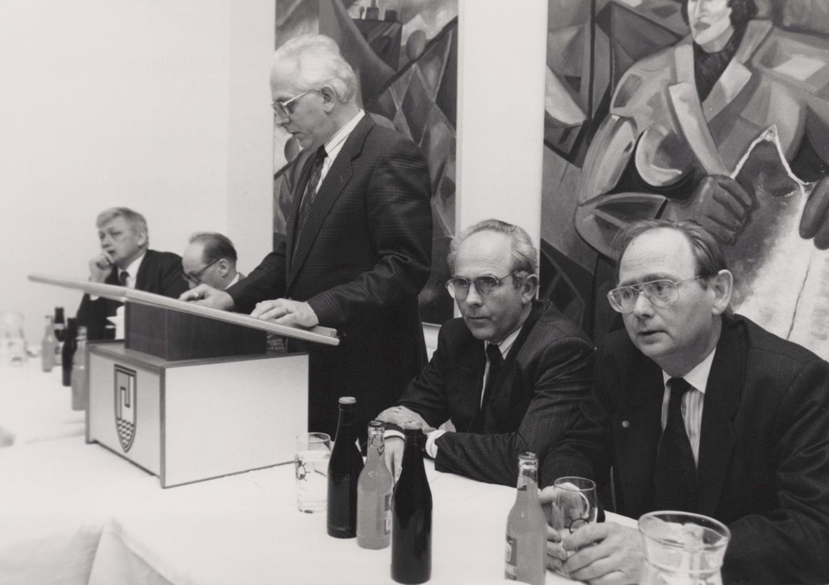 Myndir sem tengjast Verkalýðs og sjómannafélagi Gerðahrepps á Suðurnesjum. Stjórnmálamenn á fundi hjá fiskverkafólki í Garðinum 20. mars 1991, vegna krafna um hækkuð skattleysismörk. Frá vinstri: Halldór Blöndal, Sigurður T. Sigurðsson, fundarstjóri, Jóhann Einvarðsson og Karl Steinar Guðnason.