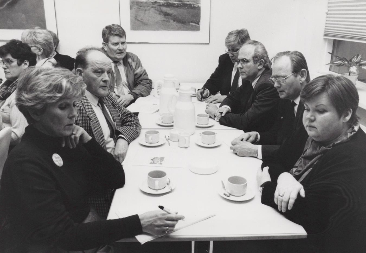 Myndir sem tengjast Verkalýðs og sjómannafélagi Gerðahrepps á Suðurnesjum. Frummælendur á fundi um skattleysismörk með fiskvinnslufólki í Garðinum 20. mars 1991. Kristín Sigurðardóttir, Kvennalista (fremst til hægri), Karl Steinar, Jóhann Einvarðsson, Halldór Blöndal - Sigurður T. Sigurðsson.