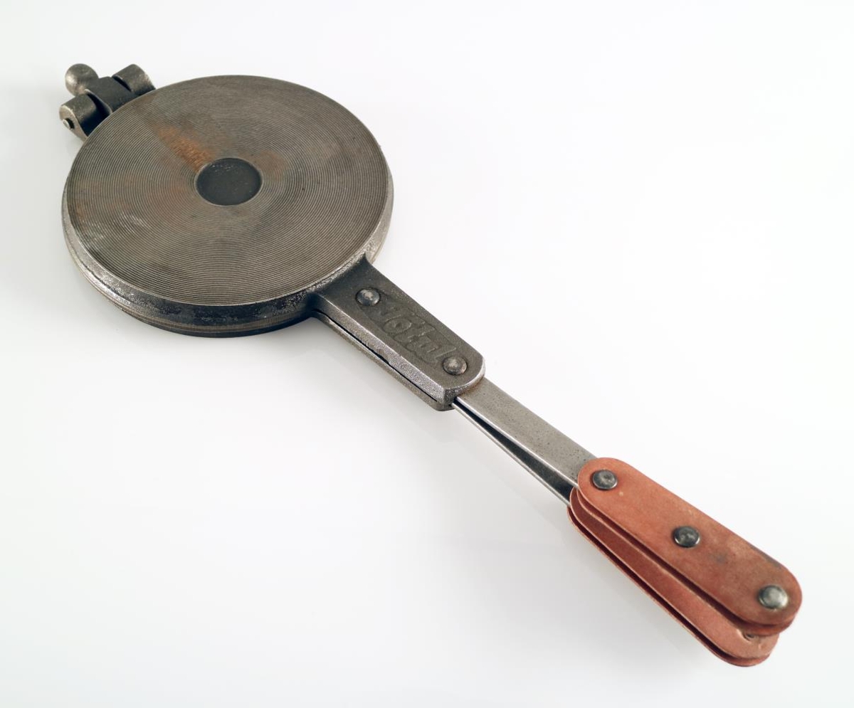 Kramarhúsajárn úr pottjárni, til að nota á eldavélahellu. Bökunarplöturnar eru hringlaga, 14,5 cm að þvermáli. Höldur ganga úr plötunum, um 23 cm að lengd. Á endum þeirra, utan um járnið, eru rauðbrúnar og stífar plötur sem líkjast leðri. Mynstrið er fagurt jurtaskreyti sem myndar hjarta fyrir miðju. Mynstrið kallast "Østerdalsmønster", sem vísar í Østerdalen í austur Noregi. Samfelld lengd kramarhúsajárnsins er 42 cm. Kramarhúsajárn voru notuð til að baka norskar vöfflur sem kallast krumkake, en þeim er rúllað upp á meðan þær eru enn heitar svo þær mynda kramarhús.