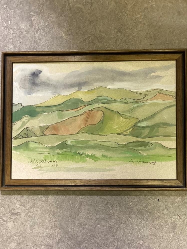 Vatnslitamynd. Landslag og bæjarrúst í Granagiljum í Skaftártungu. Málað 1981. Stærð 39 x 30 cm. Gunnar Hjaltason gullsmiður og listmálari í Hafnarfirði gaf Skógasafni þrjár vatnslitamyndir, sem safnið lét innramma.