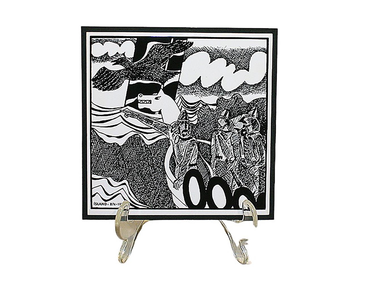 Þrír ferkantaðir veggplattar og er trérammi utan um. Gefið út í tilefni af 1100 ára afmæli landnámsbyggðar. Myndskreyting eftir Einar Hákonarson. Myndefni Landnemar að kveikja eld - Flóki, þar sem hann stendur upp á fjalli og sér yfir fjörð fullan af hafís - Flóki á leið til Íslands, þar sem hann sleppir þremur hröfnum. Gefandi Rotaryklúbbur Akraness