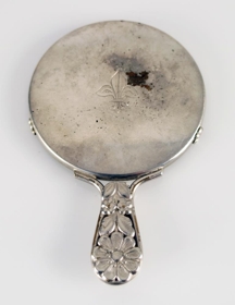 Smágerður snyrtispegill / handspegill. Glerið er kringlótt, 6,2 cm að þvermáli. Lengd spegilsins með handfanginu er 9,8 cm. Umgjörðin og handfangið er úr silfurlituðum málmi. Blaða- og blómaskreyti er á handfanginu. Þríblaða jurtaskreyti er greypt fyrir miðju í speglinn aftanverðan.