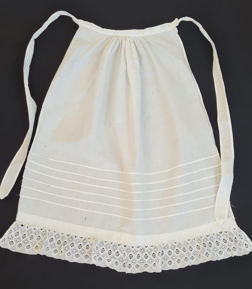 Hvít léreftssvunta. Vélsaumur og handsaumur. Keypt blúnda. Átti og vann Katrín Gunnarsdóttir (1900-1935) Ljótsstöðum Vopnafirði.Jóhanna Sigurjónsdóttir(1900-1992) húsfreyja Ljótssstöðum frá 1923-1966 varðveitti svuntuna. Gefandi er dóttir hennar