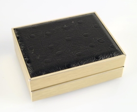 Askjan sem hnapparnir koma í hefur gyllta málmumgjörð, lok og botn eru úr svörtu leðurlíki. Lokið er skreytt upphleyptum doppum en botninn er flatur. Askjan er fóðruð með rauðu flaueli. Hún er 8 x 6,2 cm að stærð og 3 cm á hæð.