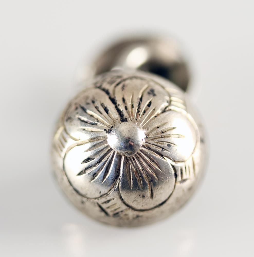 Sex ermahnappar í öskju. Allir eru þeir verulega áþekkir, en ermahnapparnir virðast þó vera af nokkrum ólíkum gerðum. Hnapparnir eru kúptir, hálfkúlulaga og holir að innan. Fimm blaða blóm er grafið í þá, úr miðju blóminu gengur tota eða bóla. Bakhlið fimm þeirra er eilítið ávöl en hún er flöt á þeim sjötta. Á hnappi þeim sem hefur flata bakhlið eru smiðsstimplarnir ME og EM. Lykkja er soðin við bakhlið hnappanna og er hún hlekkjuð við aðra lykkju sem soðin er við ávala og hringlaga plötu. Hlekkirnir sem halda móthliðunum saman eru af ólíkum toga. Tveir hnappanna eru gylltir en hinir fjórir silfurlitaðir. Sá sem hefur smiðsstimplana er líklega úr silfri, en hinir úr annars konar málmi. Hnapparnir eru svipaðir að stærð. Þeir eru 1,3-1,4 cm að þvermáli og 2,3-2,6 cm að lengd.