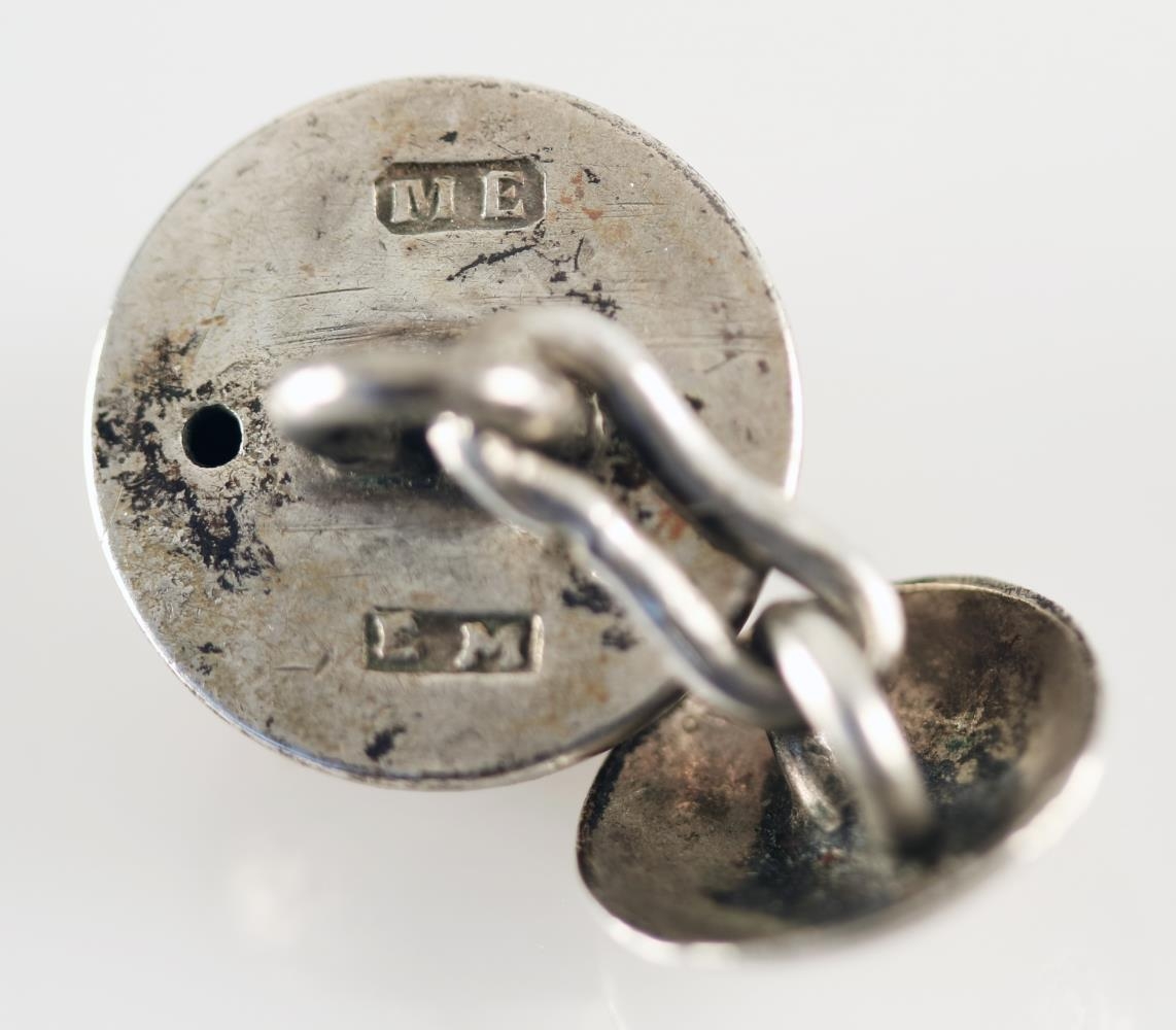 Smiðsstimplarnir EM og ME eru stimplar feðganna og gullsmiðanna Erlends Magnússonar (f. 1849, d. 1909) og Magnúsar Erlendssonar (f. 1883, d. 1932). Erlendur var fæddur að Bollastöðum í Flóa og var sonur Magnúsar Erlendssonar bónda (f. 1807, d. 1876) og Katrínar Símonardóttur (f. 1808, d. 1868). Erlendur nam gullsmíðar hjá Benedikt Ásgrímssyni (f. 1845, d. 1921). Magnús var sonur Erlends og konu hans, Halldóru Soffíu Henriksdóttur (f. 1851, d. 1932). Hann nam gullsmíðar hjá föður sínum í Reykjavík, þar sem fjölskyldan var búsett. Hann lærði drifsmíði í Kaupmannahöfn. Þeir feðgar smíðuðu lengi saman og eru margir gripir þeirra merktir smiðsstimplum þeirra beggja. Ekki er víst að þeir feðgar hafi smíðað fleiri hnappa en þann sem merktur er þeim. Sá hnappur er frá um 1900-1932 þegar smiðsstimplar þeirra feðga voru í notkun. Hinir hnapparnir eru líklega frá svipuðu tímabili.