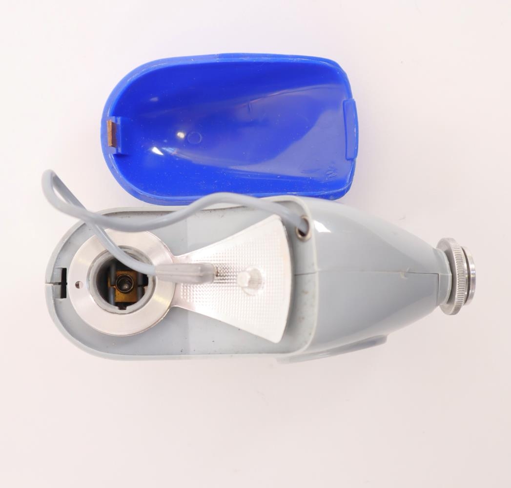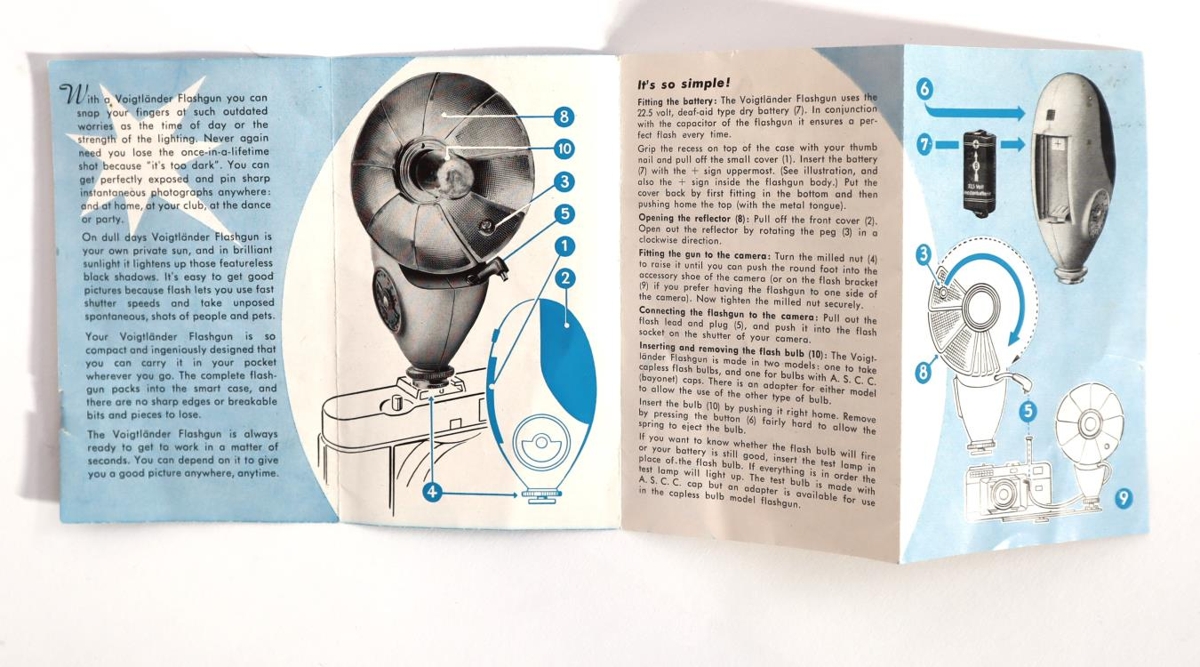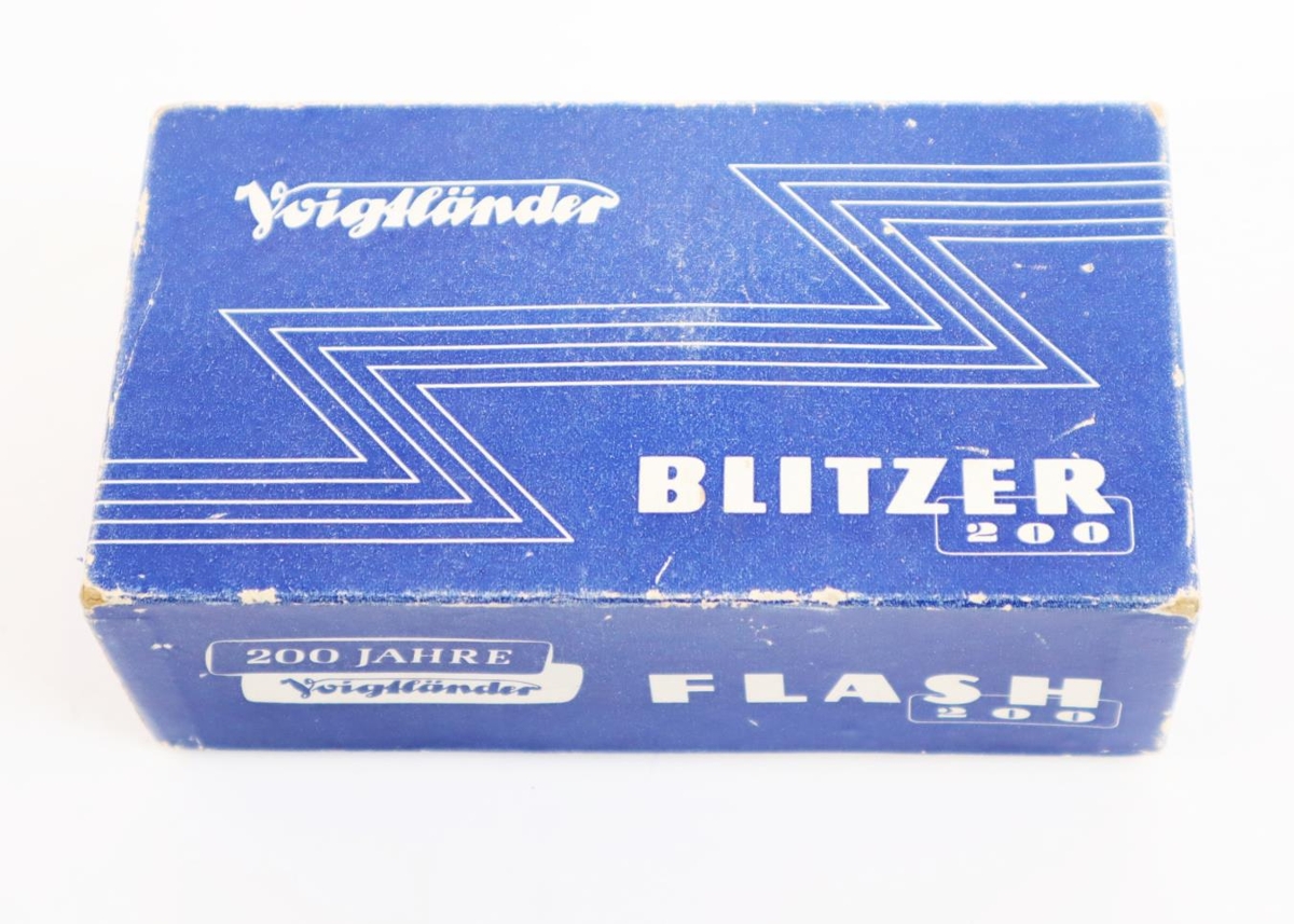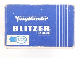 Flass fyrir myndavél af gerðinni "Voigtlander Flash 200". Þessi skráning innheldur flassið sjálft sem flassperan er sett í, bæklingur og 3 perur og pappakassi utan um þær.