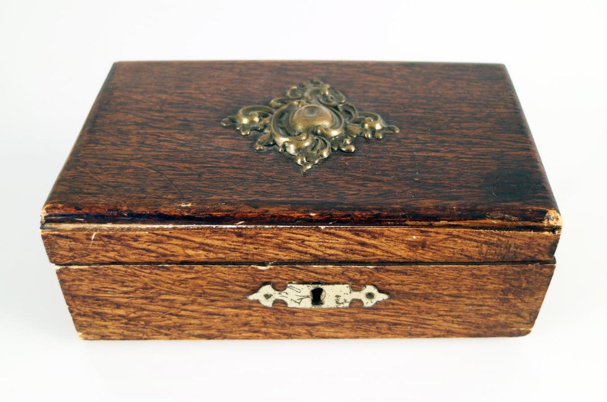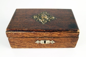 Saumakassi / saumaaskja / saumaskrín úr viði. Upphleypt skreyti úr málmi er á lokinu miðju. Skrá er á öskjunni en enginn lykill fylgir. Askjan er fóðruð að innan, lok og botn með rauðum textíl en hliðarnar með pappa í sama lit. Í lokinu innanverðu er festur borði sem nota má til að tylla áhöldum undir. Askjan er 16 cm á lengd, 9,5 cm á breidd og 6 cm á hæð.