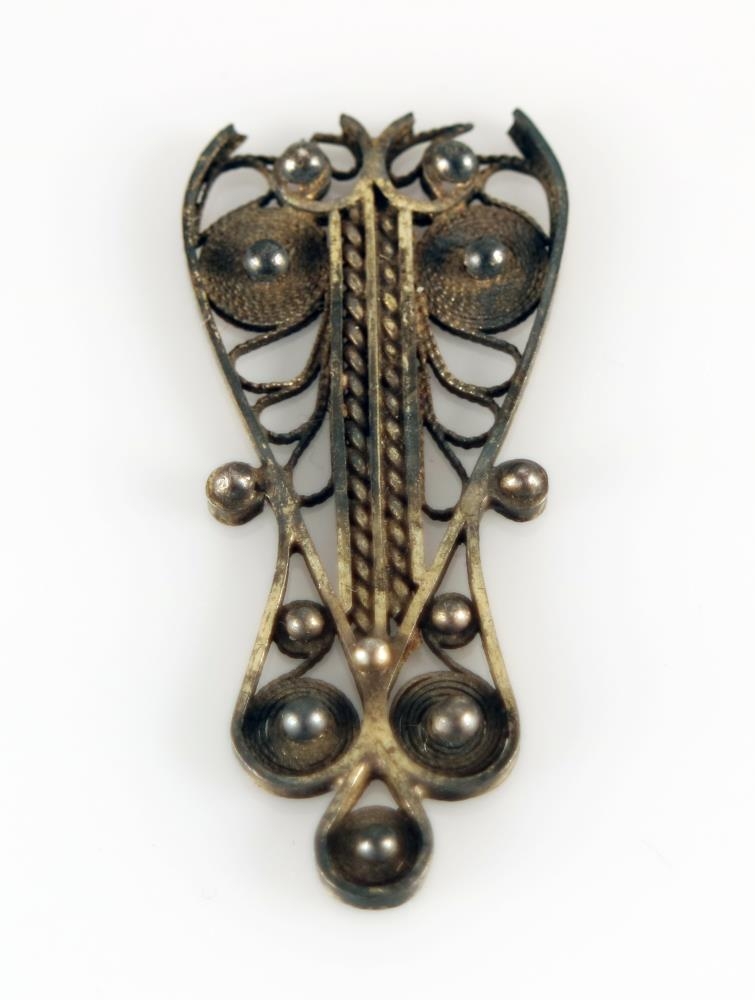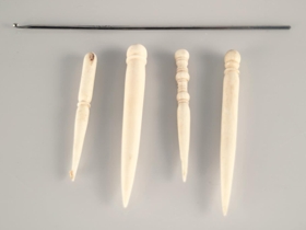 Í öskjunni eru þrjú pren úr renndu beini. Prenin eru oddmjó, en pren voru m.a. notuð til að gera göt í hannyrðum. Eitt prenanna er 8,2 cm að lengd og 0,7 cm að þvermáli þar sem það er breiðast. Hnúður situr á enda haldsins, fyrir neðan hann eru tvær renndar skífur. Annað prenanna er 8 cm að lengd og 0,9 cm að þvermáli þar sem það er breiðast. Líkt og á hinu er hnúður á enda haldsins, hann situr á einni skífu. Þriðja prenið er 6,6 cm að lengd og 0,6 cm að þvermáli þar sem það er breiðast. Haldið er samsett úr þremur hnúðum, á milli þeirra eru skífur. Í öskjunni eru einnig tvær heklunálar. Önnur þeirra er úr renndu beini líkt og prenin. Hún er 6,4 cm að lengd og 0,5 cm að þvermáli þar sem hún er breiðust. Rennd skífa er í miðju haldinu. Hin heklunálin er úr málmi, merkt framleiðandanum INOX og stærðinni 2. Í öskjunni er jafnframt brotið víravirki, það hefur mögulega tilheyrt skarti.