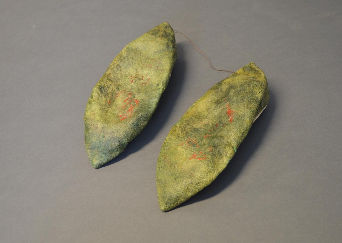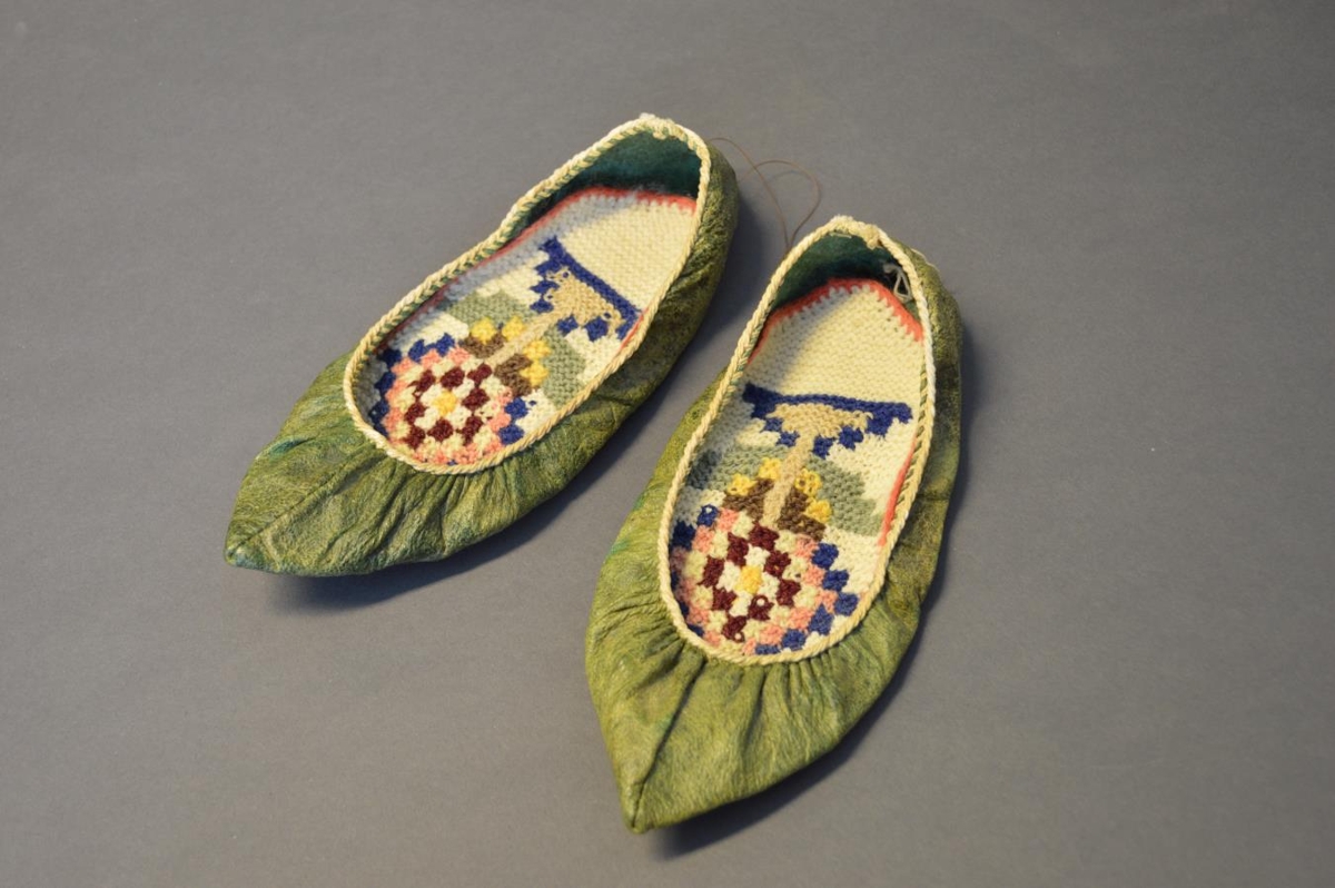 Sauðskinsskór úr blásteinslituðu skinni. Eru með útprjónuðum börðum (jurtapottur). Hvorttveggja verk gefanda um 1985. Gefið af Kristínu Friðriksdóttur frá Norður-Hvoli í Mýrdal (f 1910):