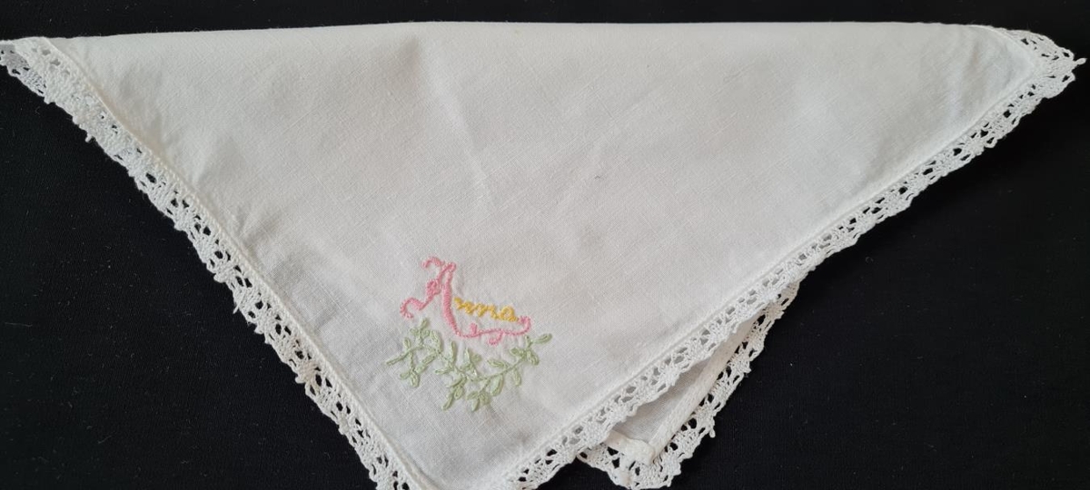 Vasaklútur, merktur "Anna" með bleikum og gulum litum. Eign og handverk Önnu Sigurðardóttur frá Ljótsstöðum Vopnafirði. Húsfreyja á Felli Vopnafirði frá 1966.
