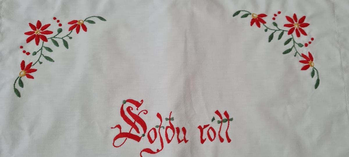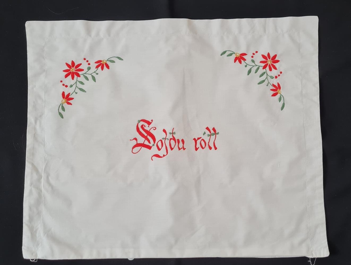Hvítt koddaver með útsaumuðum blómum og "sofðu rótt". Grænir og rauðir litir.Flatsaumur og kontorstiingur. Eign og handverk Önnu Sigurðardóttur Felli Vopnafirði.