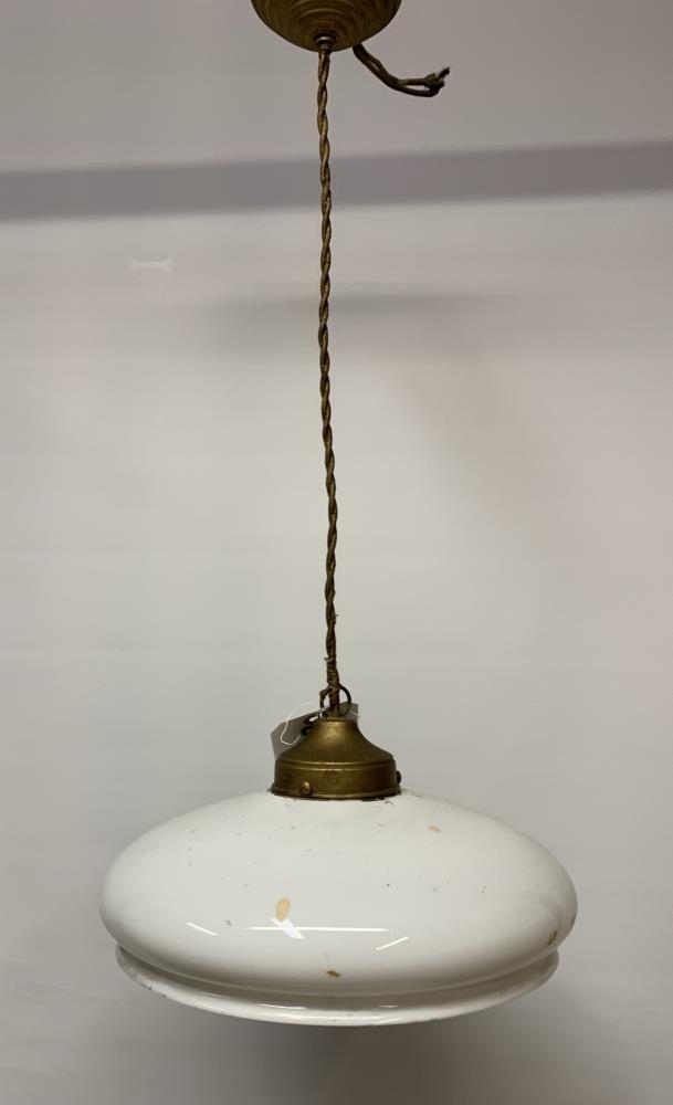 Loftljós með hvítum glerkúpli. Rafmagnsljós með tausnúru.