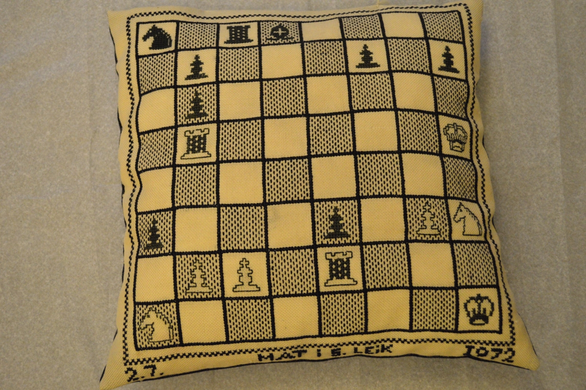 Útsaumaður púði, 40 cm. í þvermál, svartur á neðri hlið, ljós á efri hlið og þar í saumað með krosssaumi taflborð með taflmönnum skipað í reiti. Úr dánarbúi Sigurbjargar Pálsdóttur og Ársæls Sigurðssonar í Blönduhlíð 7, Reykjavík. Verk Sigurbjargar.