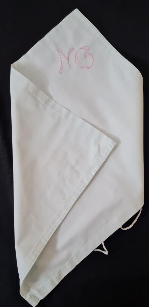 Ljósgrænt svæfilver, merkt NG með bleikum og ljósbláum lit. Handvverk Önnu Sigurðardóttur Felli Vopnafirði sem hún hefur merkt manni sínum Níelsi Gunnlaugssyni (1933-2019).