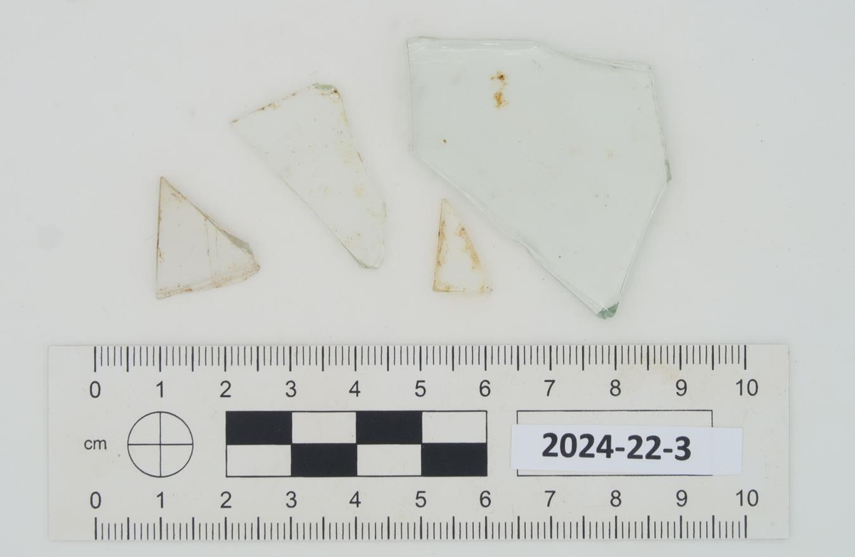 Fjögur glær og slétt glerbrot. Eitt brotið er stærst, þykkara en hin og aðeins grænleitt.