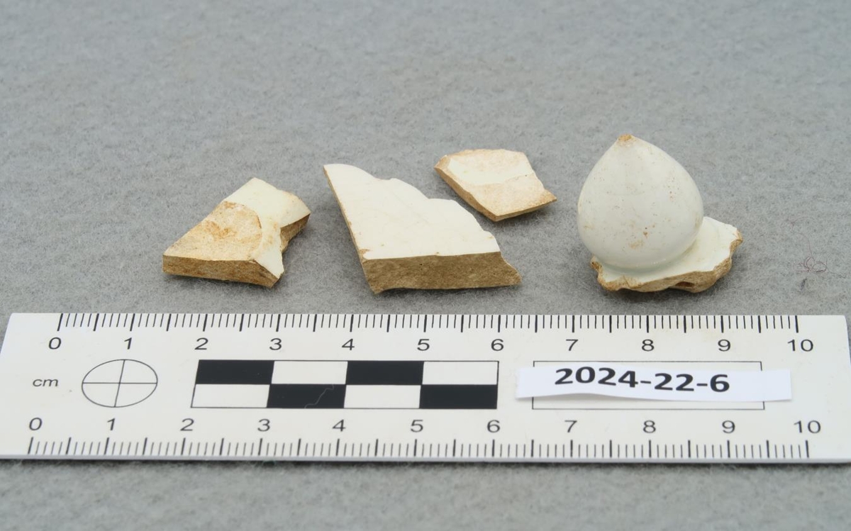 Fjögur hvít leirkersbrot með hvítum glerungi. Sennilega úr sama íláti. Eitt brotið gæti verið hald á t.d. teketilsloki.