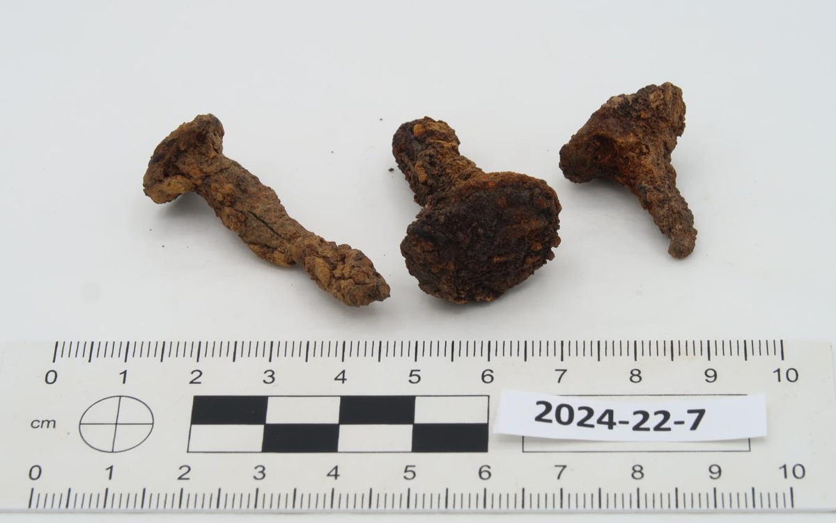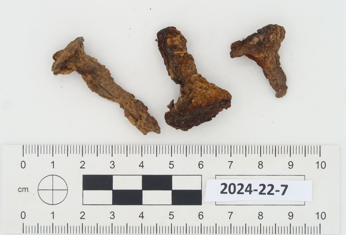 Þrír járnnaglar, mislangir með misstóra hausa.
