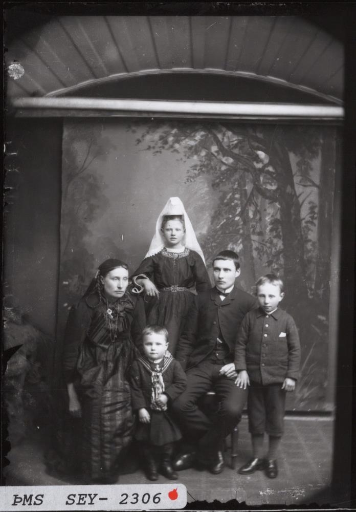 Hópmynd. Stúlka í kringum fermingaraldur í kyrtilbúning. Með henni er kona um miðjan aldur, ungur karlmaður og tvö börn. Sennilega fermingarmynd.