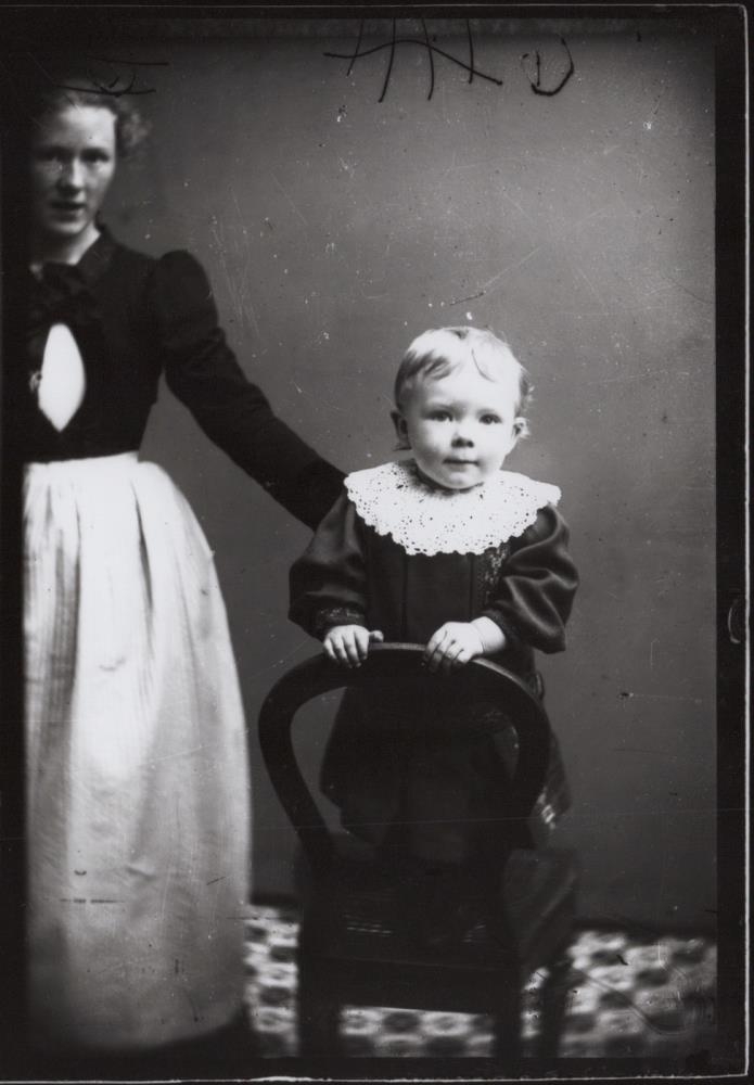 Lítið barn stendur á stól, til hliðar stendur ung kona í peysufötum og heldur við barnið.