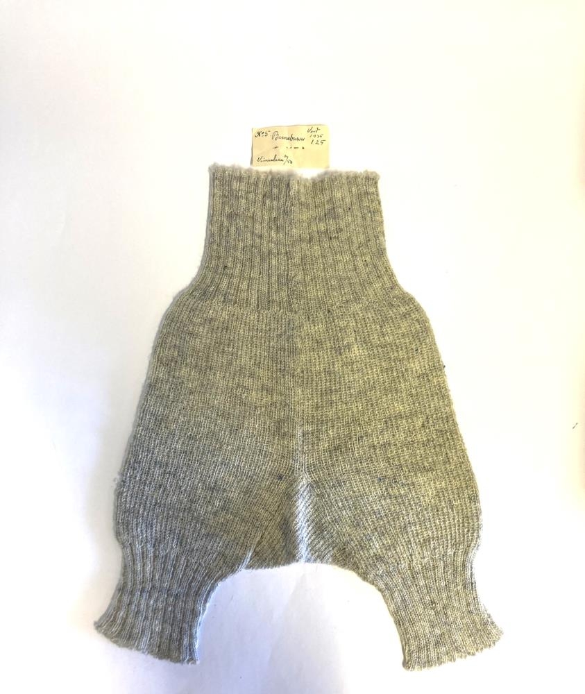 Barnabuxur, blákirningur. Úr sýnishornasafni Sambands sunnlenskra kvenna (SSK), gjöf til SSK árið 1935 frá Halldóru Bjarnadóttur Mólandi, Blönduósi. Söluverð 1935: 1,25 kr, vinnulaun 0,50 kr.