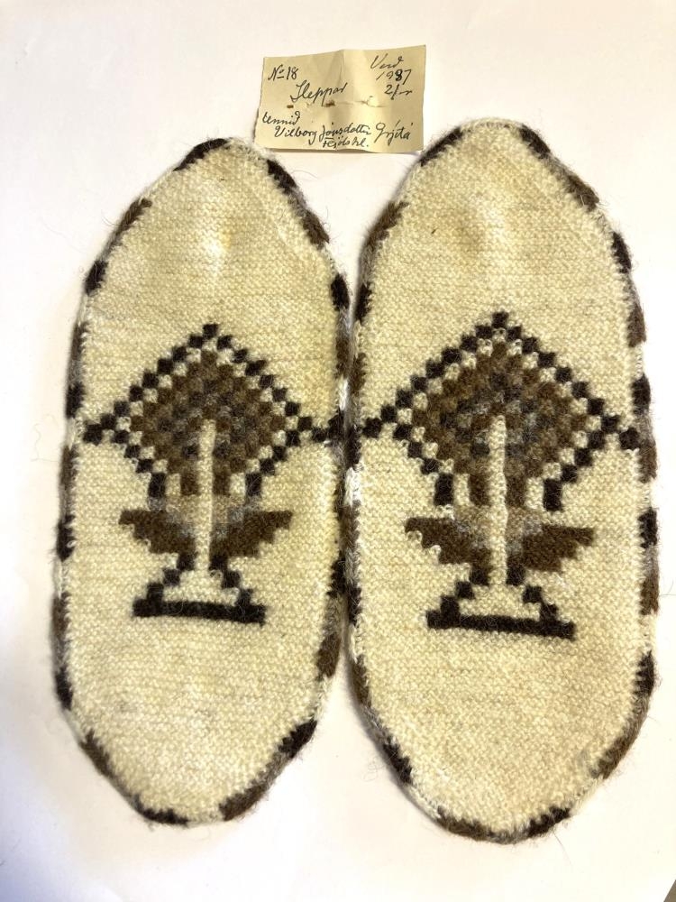 Íleppar í sauðalitum, mynstur jurtapottur. Verk Vilborgar Jónsdóttur Grjótá í Fljótshlíð. Úr sýnishornasafni Sambands sunnlenskra kvenna (SSK), frá árinu 1937. Söluverð 1937: 2,00 kr.