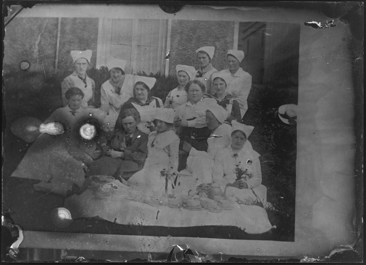 Eftirtaka eftir hópmynd, tvær manneskjur greindar á meðfylgjandi pappír. Fremri röð f.v.: 1. Ingibjörg H. Bjarnason, 2. Ragnheiður Jónsdóttir. Nemendur Kvennaskólans ásamt skólastjóra og kennara með kaffiborð framan við skólahúsið við Fríkirkjuveg.