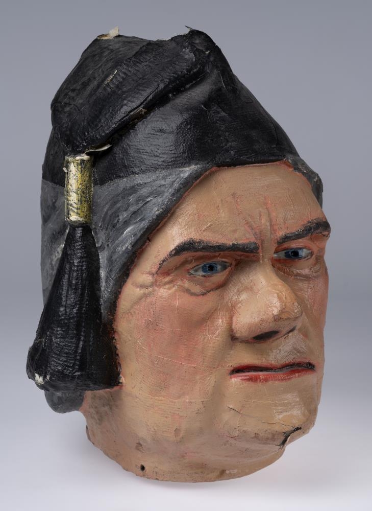 Gefendur eru mæðginin Edda Björgvinsdóttir (f. 1952) og Björgvin Franz Gíslason (f. 1977) leikarar. Gríman er ein þriggja gríma sem afhentar voru safninu og eru þær allar skráðar undir safnnúmerið Þjms. 2021-1. Grímurnar gerði leikarinn og leikstjórinn Gísli Rúnar Jónsson (f. 1953, d. 2020) fyrir sýningu Alþýðuleikhússins á Heimilisdraugum eftir Böðvar Guðmundsson (f. 1939), sem sett var upp árið 1980. Magnús Þór Þorbergsson (f. 1971), leiklistarráðunautur Borgarleikhússins, afhenti fyrir hönd gefenda. Þau mæðgin höfðu gefið leikhúsinu bækur og muni úr fórum Gísla Rúnars, þar á meðal umræddar grímur, en í samráði við gefendur var ákveðið að grímurnar ættu frekar heima á Þjóðminjasafni Íslands.
