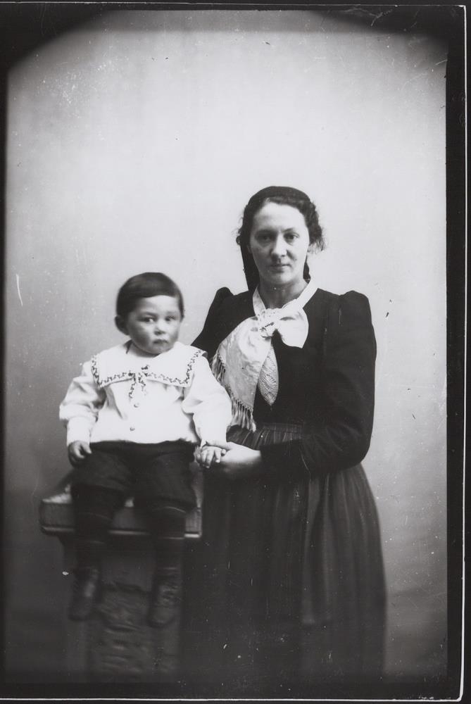 Guðríður Brynjólfsdóttir frá Engey, við hlið hennar situr lítill dökkhærður drengur. Sennilega systursonur hennar sem systir hennar Guðrún Brynjólfsdóttir átti með Þorsteini Þorsteinssyni skipstjóra.