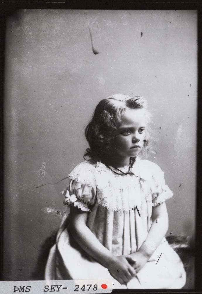 Lítil stelpa með krullað hár í kjól með blúndukraga og með hálsmen.
