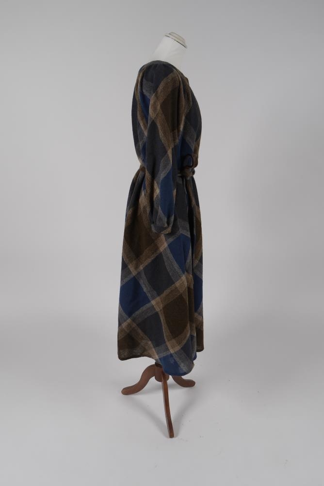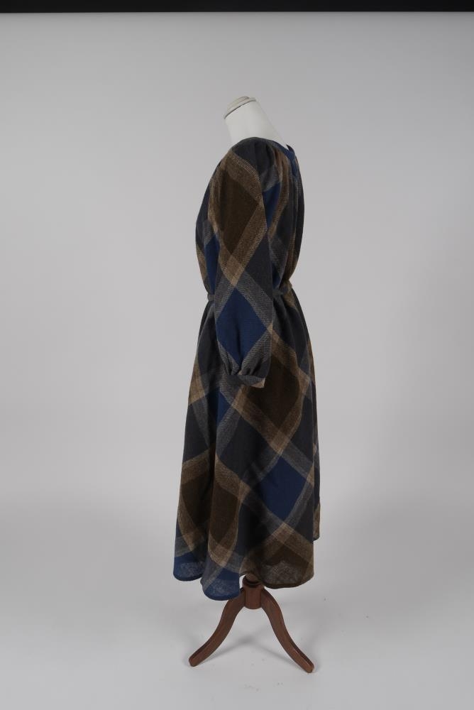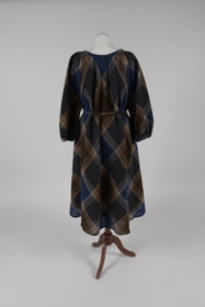Köflóttur ullarkjóll eftir Guðrúnu J. Vigfúsdóttur. Blár, brúnn og hvítur á litin. Hálsmál fremur vítt, langar ermar, laust belti.