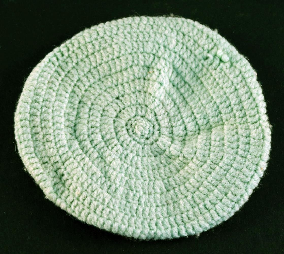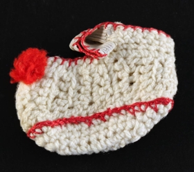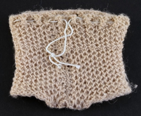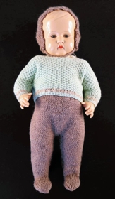 Dúkka / brúða úr plasti. Hún er í góðu ástandi en afar viðkvæm. Dúkkan er í prjónuðum fötum. Hún er klædd fjólubláum gammosíum og sægrænni peysu. Bleikur bekkur er í stroffi peysunnar og tvær hvítar tölur eru á annarri öxl hennar. Dúkkan hefur fjólubláa húfu á höfði, dúskur er á henni og er hún bundin undir höku. Dúkkan er 35 cm á hæð.