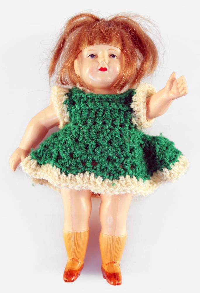 Smágerð dúkka / brúða úr plasti. Útllimir dúkkunnar eru hreyfanlegir og strengdir saman með bandi í gegnum búk hennar. Dúkkan hefur brúnt, úfið hár og þvertopp. Dökkbrúnir hælaskór og ljósbrúnir sokkar eru málaðir á dúkkuna. Hún er í hekluðum kjól, grænum að lit með hvítum köntum. Kjóllinn er stuttur, stutterma og baki hans er lokað með perlu. Á baki dúkkunnar er framleiðslumerking, þar stendur númerið "13" og "GERMANY". Dúkkan er því þýsk framleiðsla. Dúkkan er 12,5 cm á hæð. Hún er í góðu ástandi en bandið sem strengt er í útlimi hennar orðið nokkuð lauslegt.