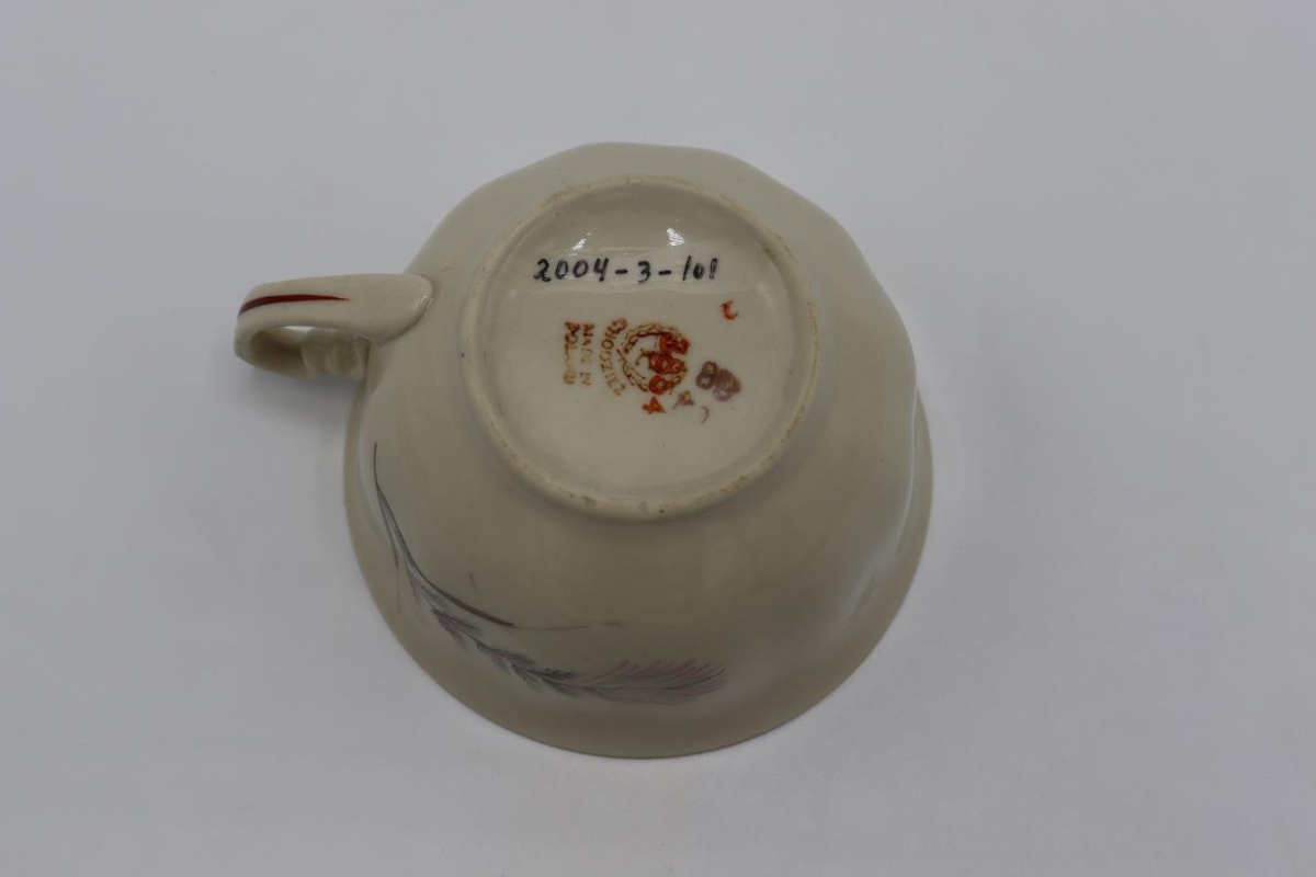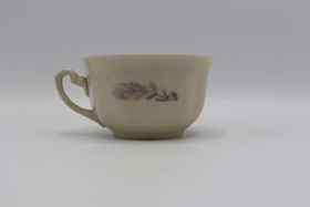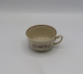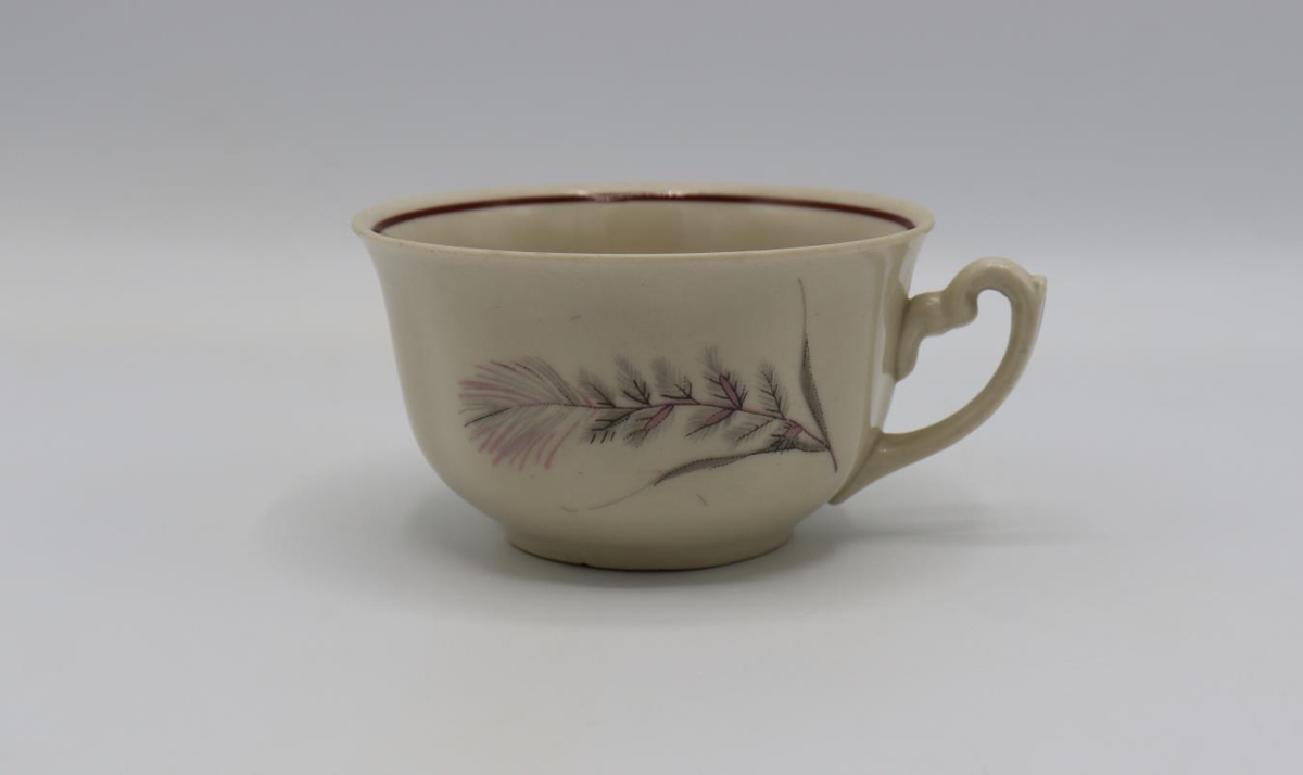 Tveir bollar úr hvítu postulíni með rauðbrúnni rönd innan á bollanum og myndum af strái, grá belik og svört. CHODZIEZ Made in Poland 3854. Undirskál með rauðbrúnni rönd við brún og sama mynstri og á bollunum. CHODZIEZ Made in Poland, 44