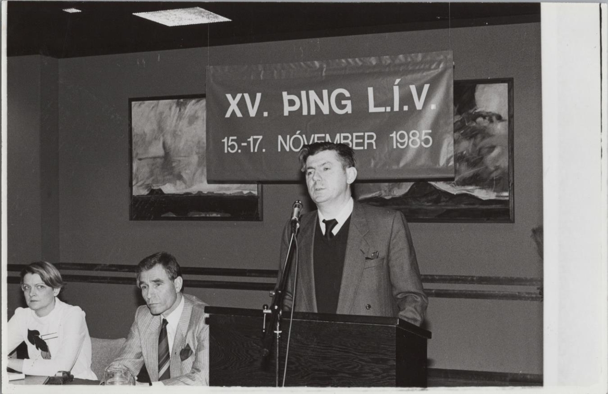 Guðmundur H. Garðarson, Magnús L. Sveinsson og Hansína Stefánsdóttir. 15. þing LÍV nóv '85.