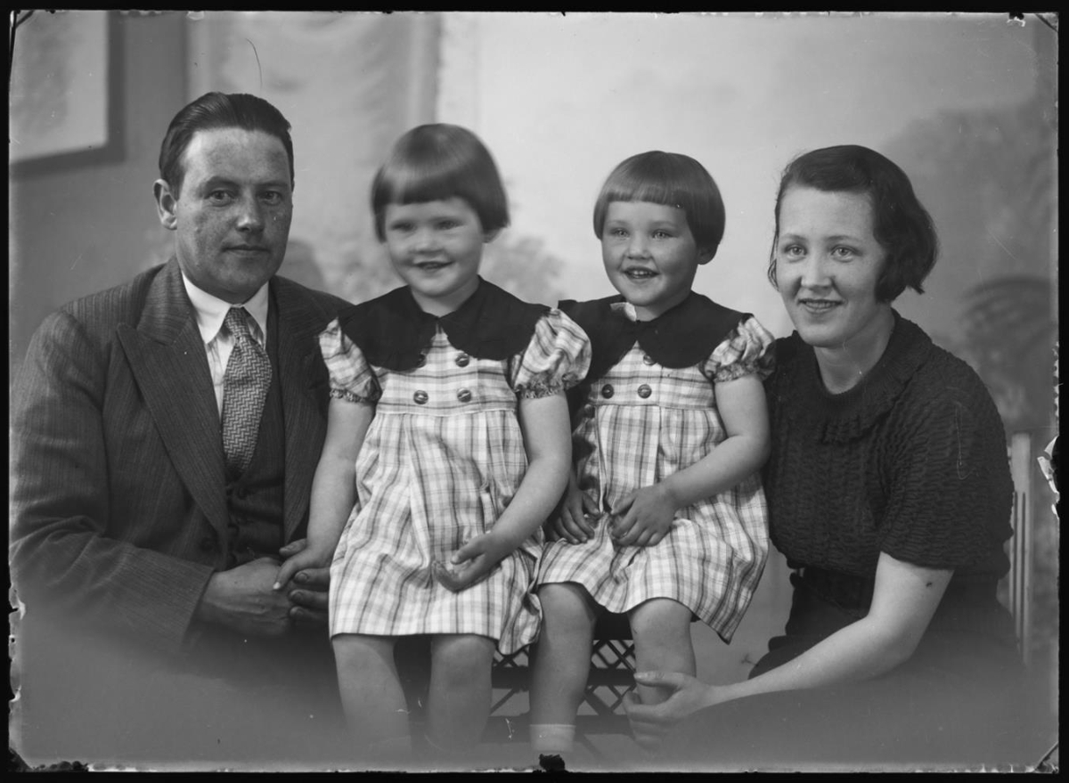 Hjón með tvær stúlkur á milli sín. Sigurður, Ebba, Jóhanna og Guðlaug Dahlmann. Myndir frá Ljósmyndastofu Jóns J. Dahlmann og Þorleifs K. Þorleifssonar.