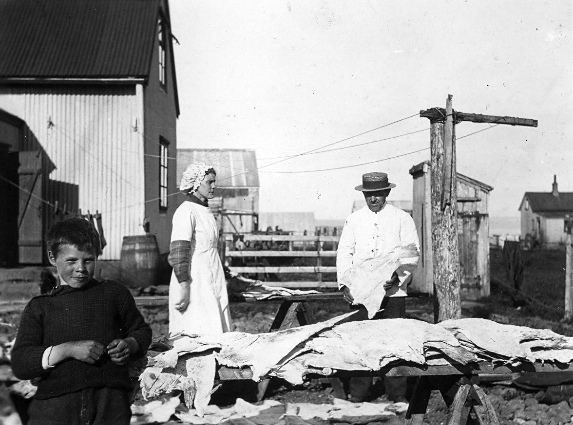 Ólafur A. Þorsteinsson á barnsaldri við Þorvarðarhús, foreldrar hans Björg Arinbjarnardóttir og Þorsteinn Þorvarðarson vinna við saltfisk við heimili þeirra. Þorvarðarhús er kennt við föður Þorsteins.