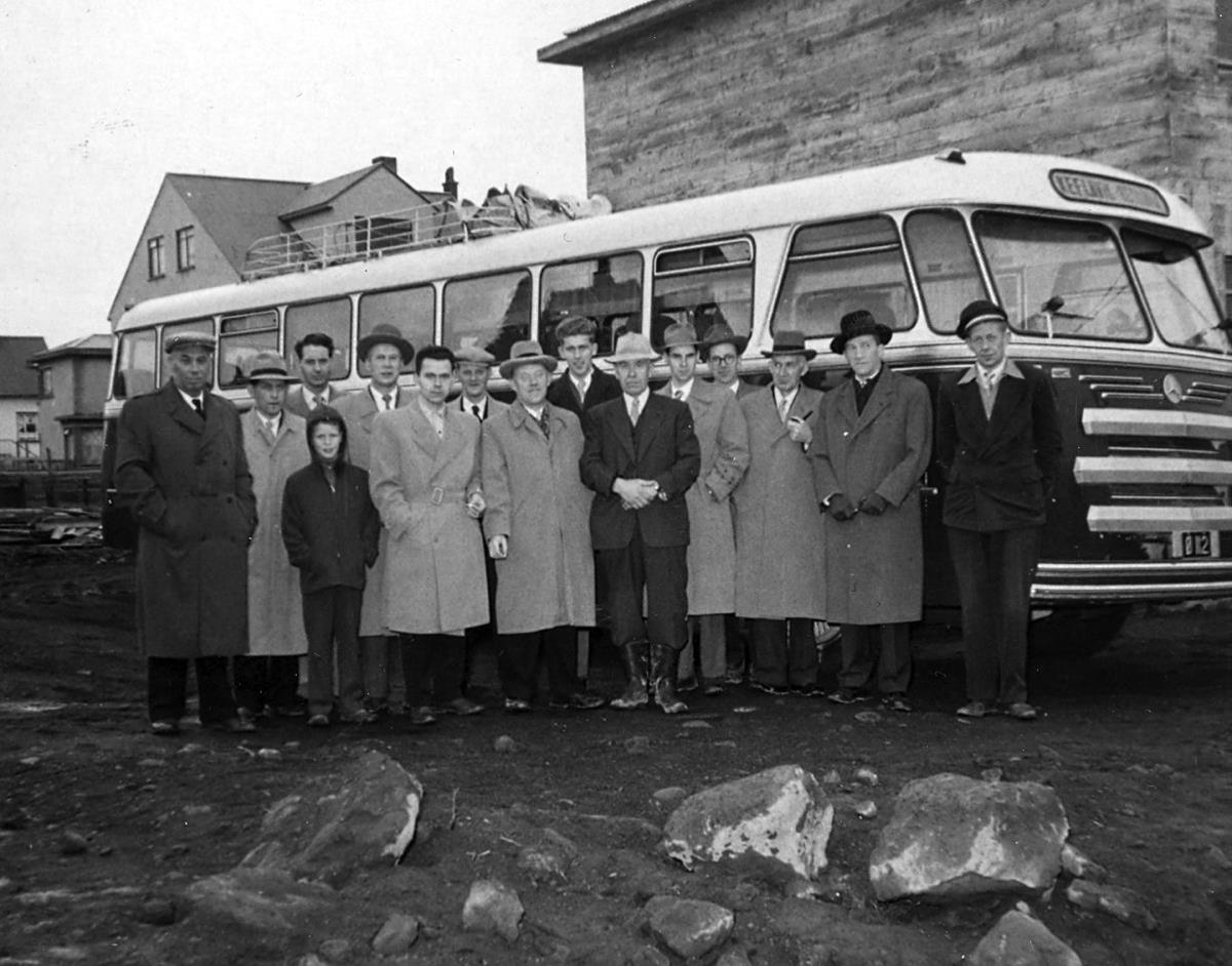 Stjórn S.B.K. Fyrir framan fyrsta dieselbílinn í flotanum. Frá vinstri: Kristinn Jónsson, Loftstöðum, Ragnar Guðleifsson, Magnús Jónsson, Hallgrímur Th. Björnsson, fyrir framan hann er sonur hans Heiðar Þór Hallgrímsson, Ásgeir Einarsson, Guðmundur Jónsson, Litlabæ, Valtýr Guðjónsson, Ingvar Guðmundsson, Skúli Hallsson forstjóri, Ólafur A. Þorsteinsson, Jóhann Pétursson, Alfreð Gíslason og Skafti bifreiðarstjóri.