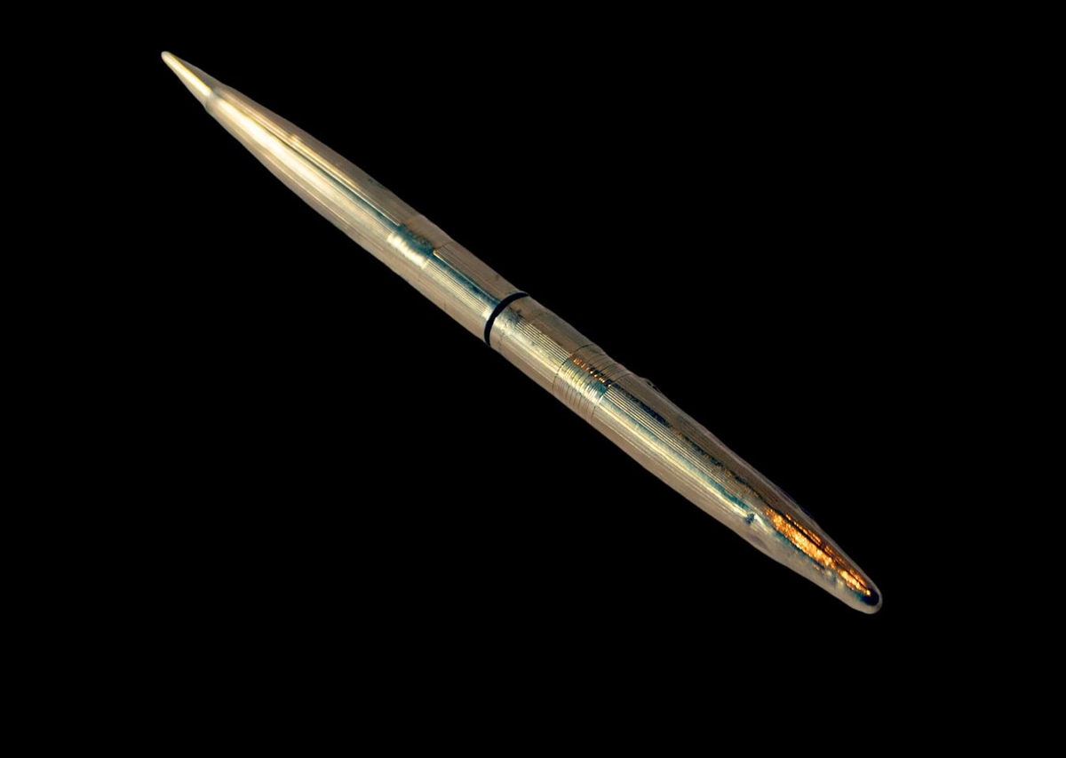 Pennasett-ágrafið :Ó.Th. Afmælisgjöf til Ólafs Thors forsætisráðherra á fimmtugsafmæli hans 19 janúar 1942 (f.19/1 1892,d. 31/12 1964) Afhent byggðasafninu á jólum 1977.Pennasettið saman stendur af tveimur gullituðum pennum .