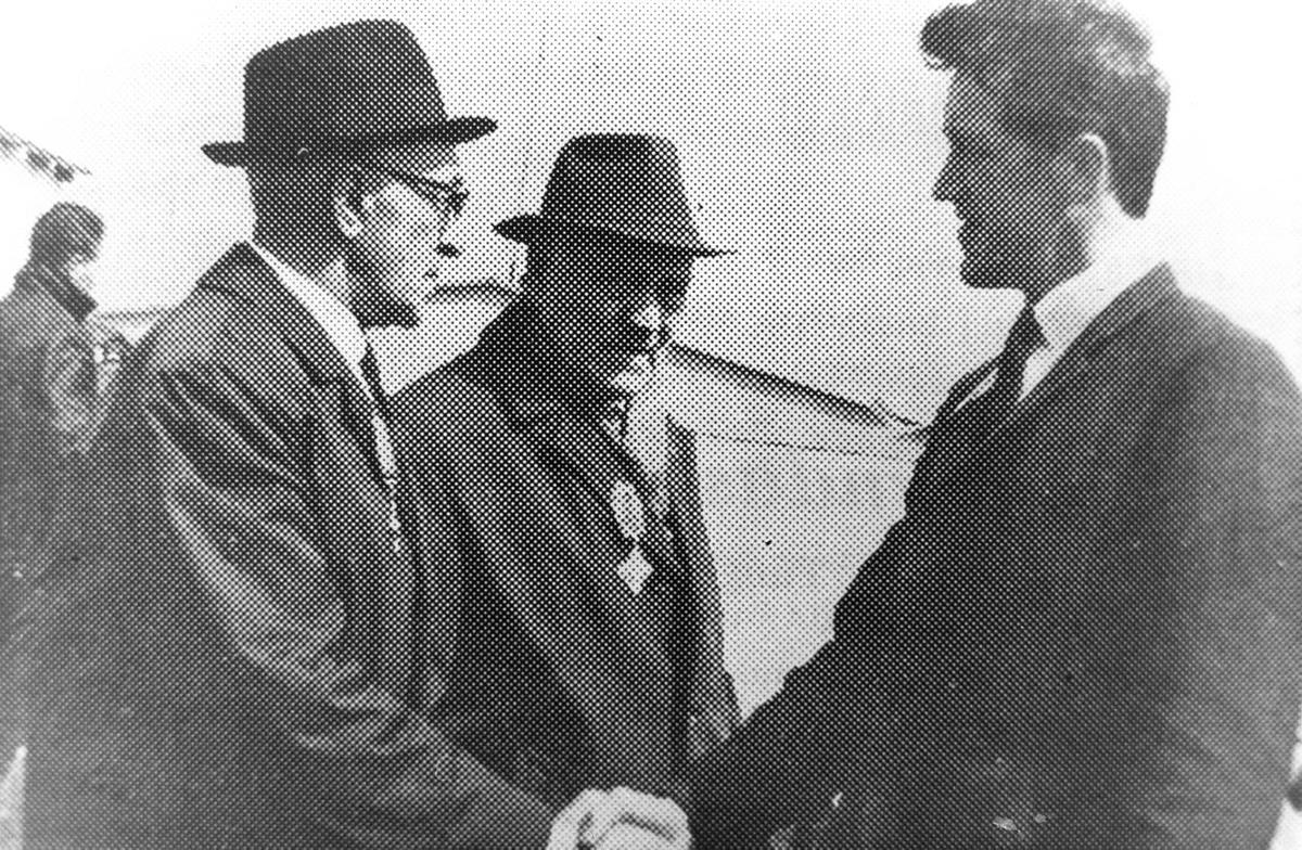Þrír menn heilsast, frá vinstri: NN, Gvendur Elís, Hörður Falsson